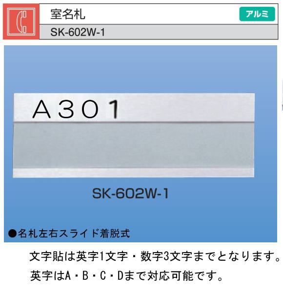 | 品番 | SK-602W-1 英字はA・B・C・D 4文字の棟・戸番号付・英字1文字、数字3文字は(ハイフォン含)対応可能 |