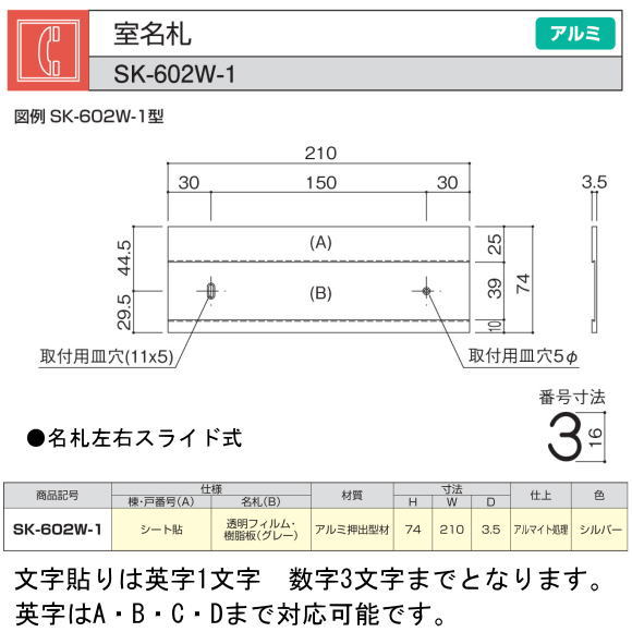 神栄ホームクリエイト(新協和) 室名札 SK-602W-1 (4文字の棟・戸番号付・英字1文字、数字3文字) シルバー H74xW210 アルミ製 名札左右スライト脱着式。文字貼の英字はA・B・C・D 数字は3文字まで対応可能 材質/本体:アルミ押出型材 アルマイト処理 棟・戸番号:シート貼 名札:透明フィルム・樹脂板(グレー) 注意:取付ねじ・プラグは付属していません。 特徴 棟・戸番号付、名札左右スライト脱着式。文字貼の英字はA・B・C・D 数字は3文字まで対応可能。カラーはシルバー、寸法H74xW210 アルミ製。