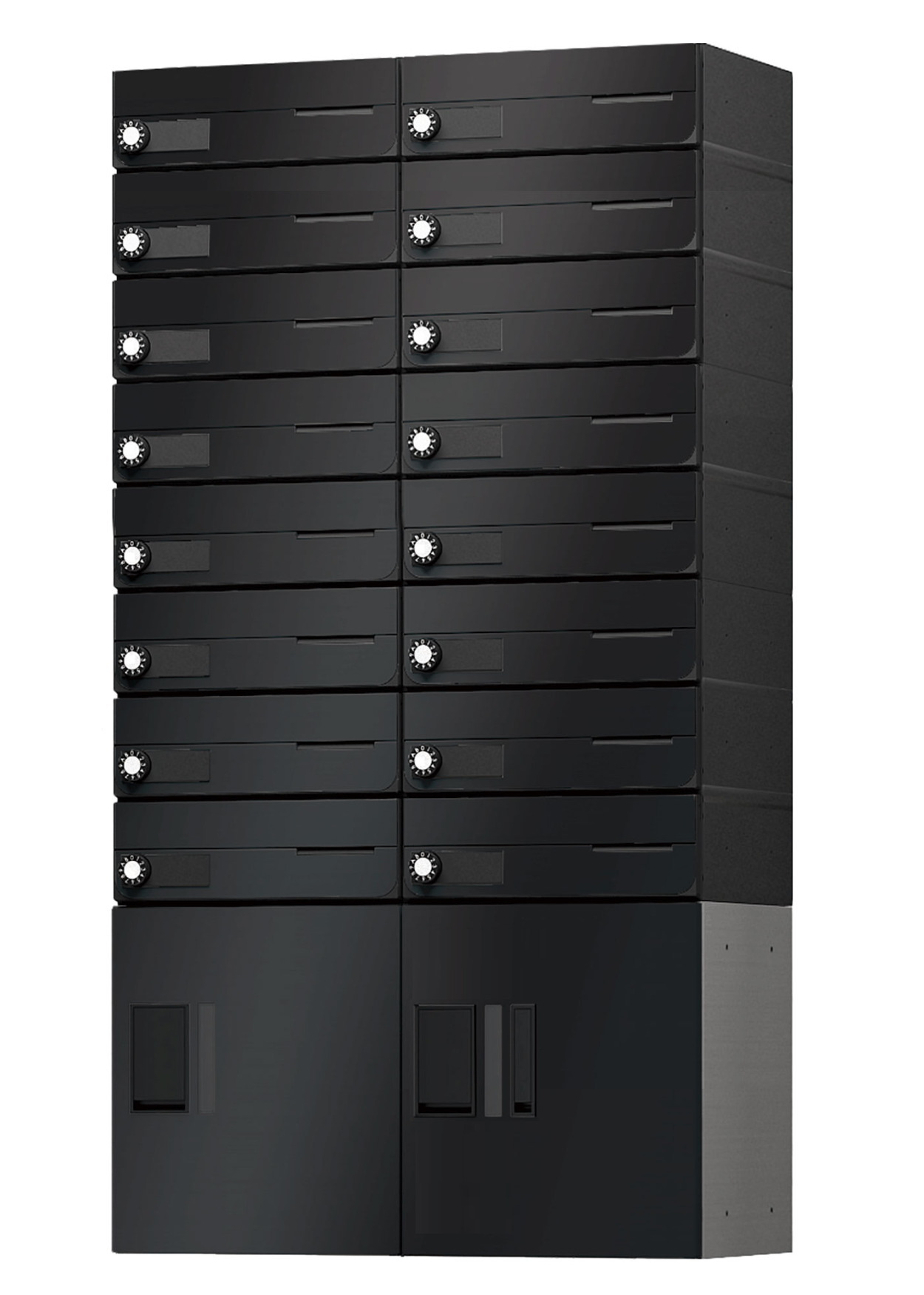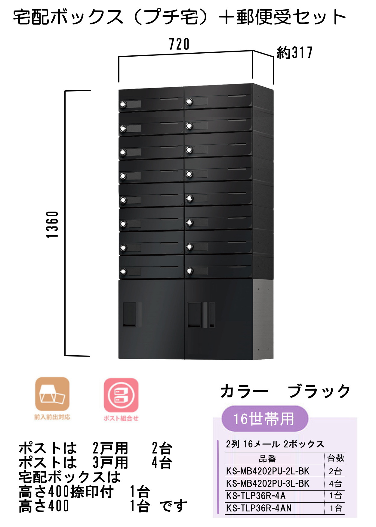 | ナスタ 集合住宅向け 宅配ボックス(プチ宅 KS-TLP36 機械式・防水タイプ)+郵便受(KS-MB4202PU防滴タイプポスト) 16世帯向 ブラック(受注生産目安納期2週間から3週間) 組立完成品寸法 高さ1360 幅720 奥行約320 居住者不在でも24時間宅配物の受け渡しができる宅配ボックス・ポストの標準セット。 |