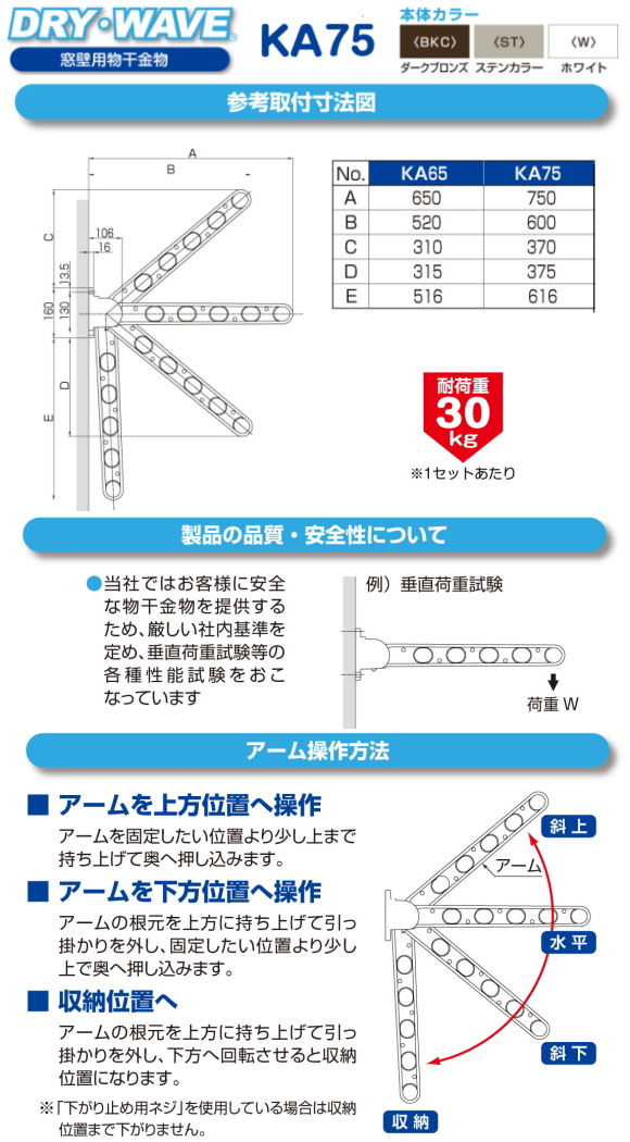 タカラ産業 窓壁用物干金物 ドライウェーブKA75 木造用ビス付 (アーム長さ750mm 1セット2本いり) 壁付け物干しの決定版!
