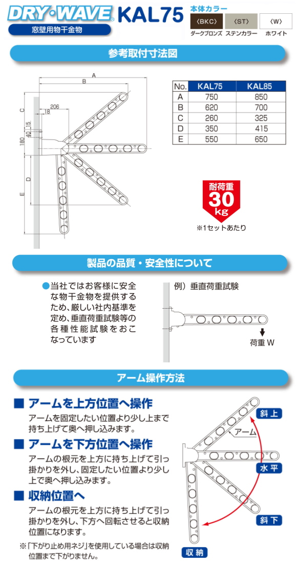 タカラ産業 窓壁用物干金物 ドライウェーブKAL75 木造ビス付(アーム長さ750mm 1セット2本いり) 壁付け物干しの決定版!