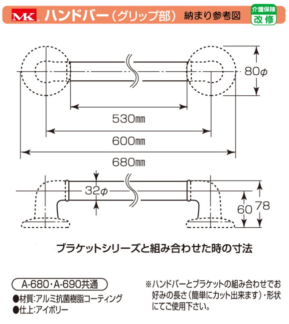 バリアフリー メイク手スリシリーズ 浴室対応樹脂コーティング手すり部品。丸喜金属 A-680-53I 32Фメイクハンドバー L=530mm