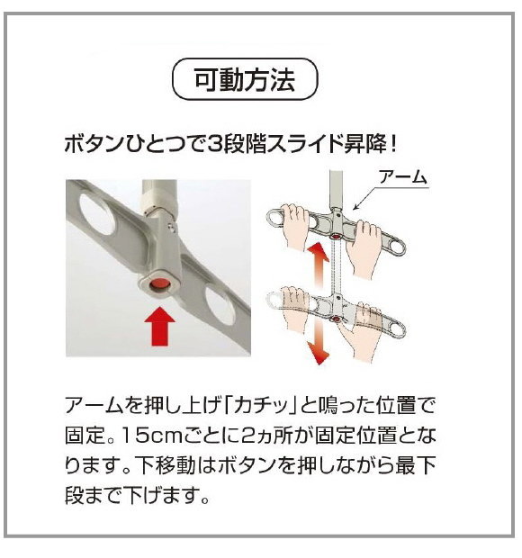 ●吊下げポールが3段階にスライド昇降。高さは900mm、750mm、600mmに固定