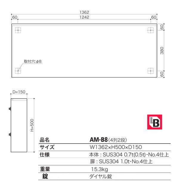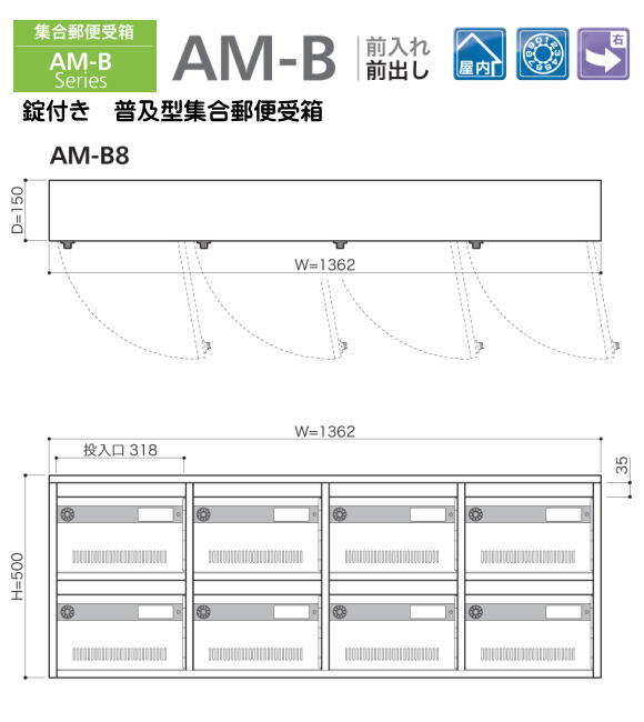 【代引不可・地域限定送料無料】錠付き 普及型集合郵便受箱。コーワソニア AM-B8 前入れ前出し ダイヤル錠 8戸用(4列2段)投入口318x35。沖縄県離島発送不可