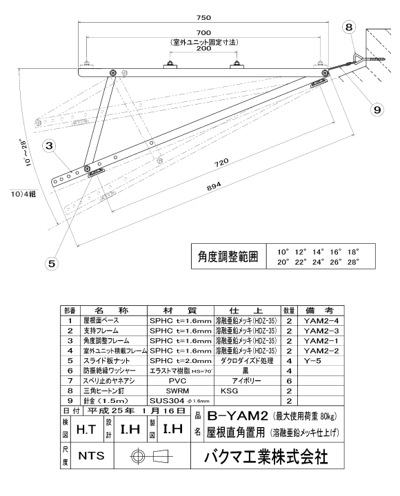 ボルトを外さずに簡単、確実に角度調整。オーソドックスな傾斜屋根据付架台。
