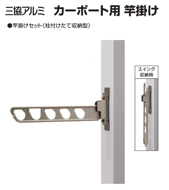 | カーポートの柱に取付。(専用竿掛け取付金具付) 三協アルミ カーポート用竿掛け セットCPSK-HTN 1セット2本入り 上45度、水辺、下25度の3段操作が可能、場所を取らないスイング収納。 | |