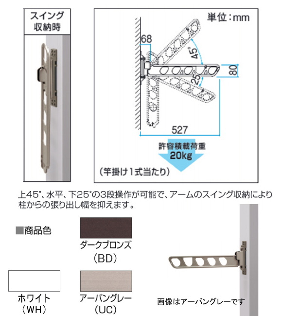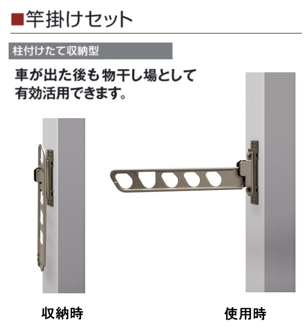 | ●カーポートの柱に取付。(専用竿掛け取付金具付) ●上45度、水辺、下25度の3段操作が可能。 ●アームのスイング収納により柱からの張り出し幅を抑えます。 ●価格は1セット2本入りの価格です。物干し竿などはついていません。 |