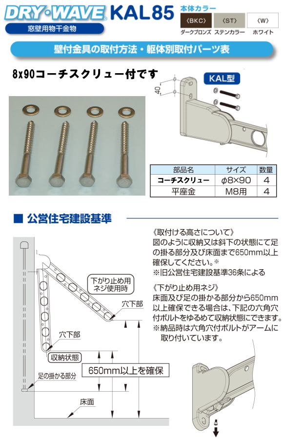 タカラ産業 窓壁用物干金物 ドライウェーブKAL85 木造ビス付(アーム長さ850mm 1セット2本いり) 壁付け物干しの決定版!