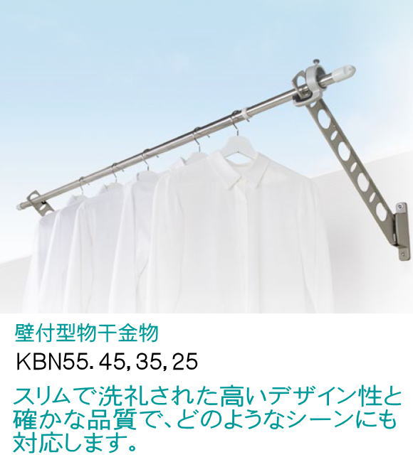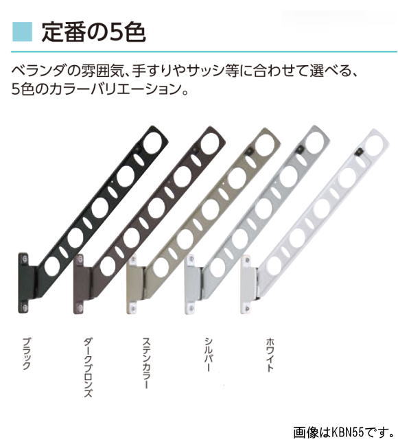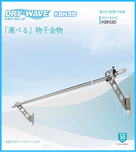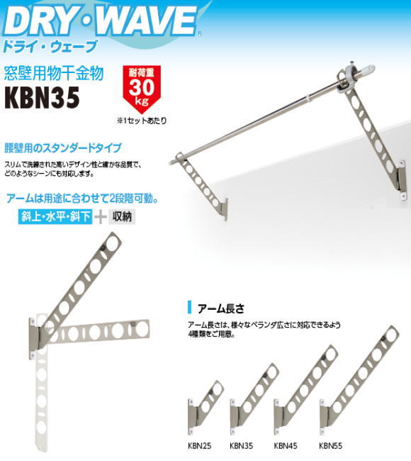 | 腰壁用物干金物 タカラ産業 DRY・WAVE(ドライ・ウェーブ) KBN35 1セット2本組 アーム長さ水平時350mm 斜上・水平・収納3方向可動 スリムで洗練された高いデザイン性と確かな品質。取付部は支柱幅の狭い手摺にもなじむ32mm幅 |