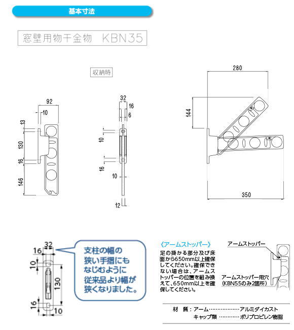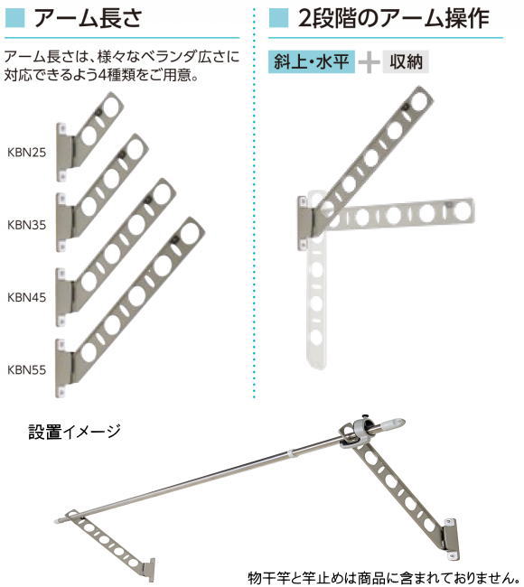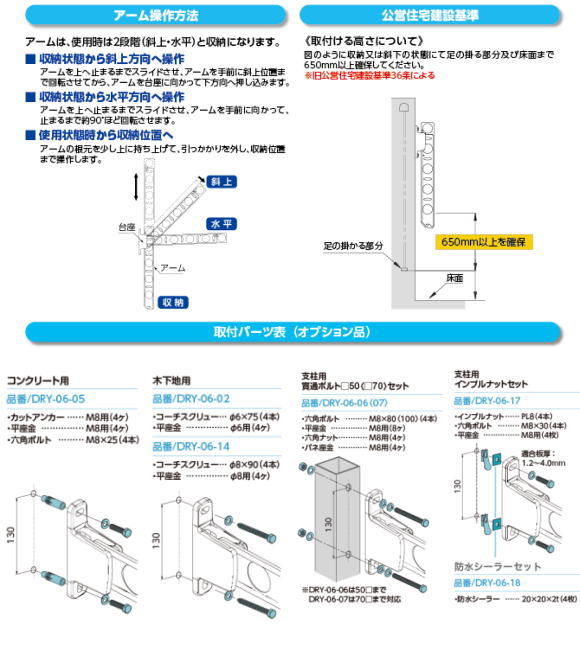 | 備考 | ●アーム長さ水平時350mm。 ●斜上・水平・収納3方向のアーム角度調整可能。 ・上斜め:物干しに適度な角度です。 ・水平:外から洗濯物を見えにくくする効果があります。 ・収納:垂直に収納できます。 床部から650mm以上確保できない場合はアームストッパーの位置を組み替えて650mm以上確保してください。 ●支柱幅の狭い手摺にもなじむ32mm幅 取付ビスは付属していません。取付場所に適合した取付ビスをご用意ください。 価格は1セット2本入りの価格です。取付ビス、物干し竿などはついていません。 取り付けに必要な道具 : 電動ドリル、水平器 |
