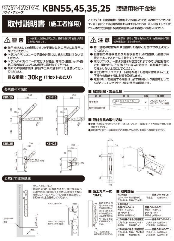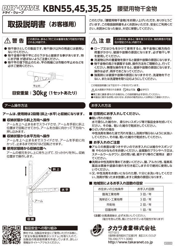 腰壁用物干金物 タカラ産業 DRY・WAVE(ドライ・ウェーブ) KBN35 1セット2本組/アーム長さ水平時350mm 斜上・水平・収納3方向可動