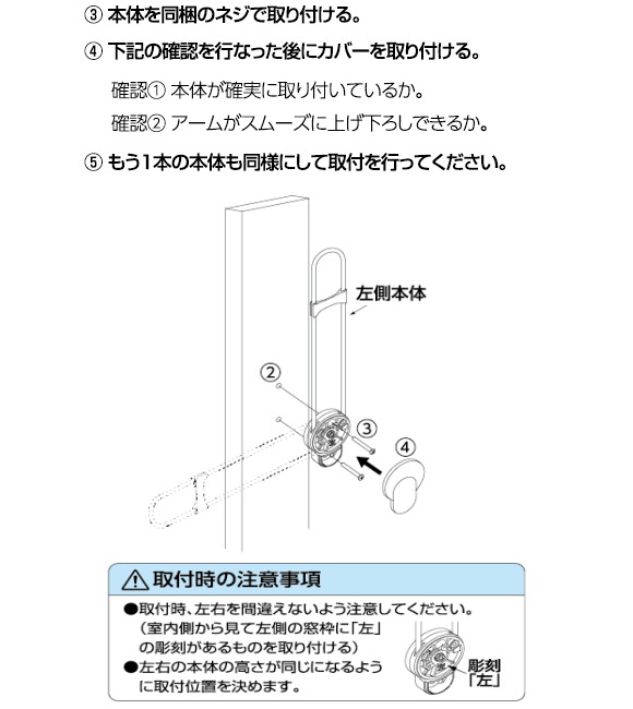 | 禁止、注意行為。 ●耐荷重8kgを超えた総重量の洗濯物を吊るさないでください。(1セット) ●高所での取付作業は部品や工具の落下に十分注意してください。 ●異常があった時は使用しないでください。 ●洗濯物は竿の一部だけに荷重がかからないように、竿に均等に干してください。 ●竿を通した場合は竿止めを使用してください。 ●小さな子どものいる家庭では、ぶつかったり、ぶら下がったりしないように十分注意してください。 |