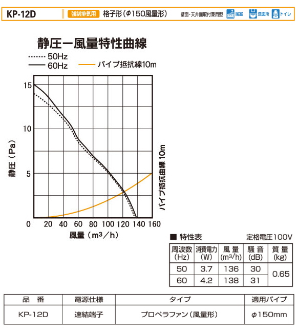 バクマ工業 KP-12D 強制排気用 格子形(Ф150風量形) 連結端子付 プロペラファン(風量形) 壁面・天井面取付兼用型 パイプ用ファン 24時間換気システム