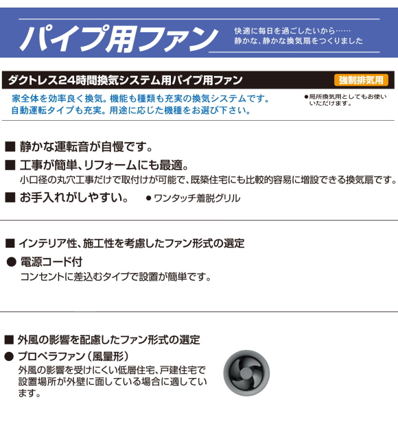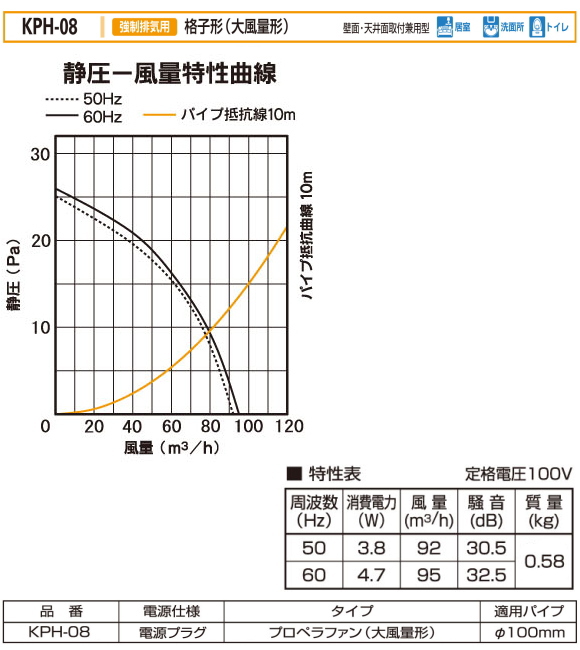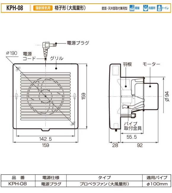 バクマ工業 KPH-08 強制排気用 格子形(大風量形) 電源プラグ プロペラファン(大風量形) 壁面・天井面取付兼用型 パイプ用ファン 24時間換気システム