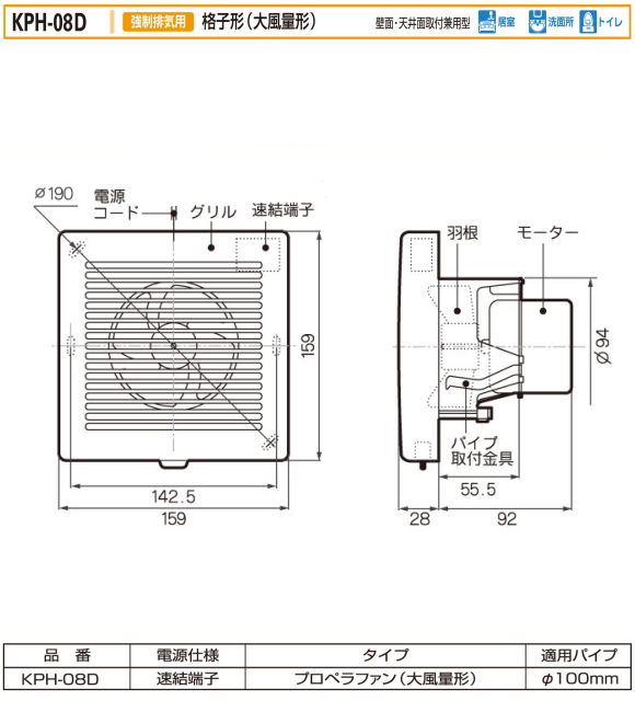 バクマ工業 KPH-08D 強制排気用 格子形(大風量形) 連結端子付 プロペラファン(大風量形) 壁面・天井面取付兼用型 パイプ用ファン 24時間換気システム