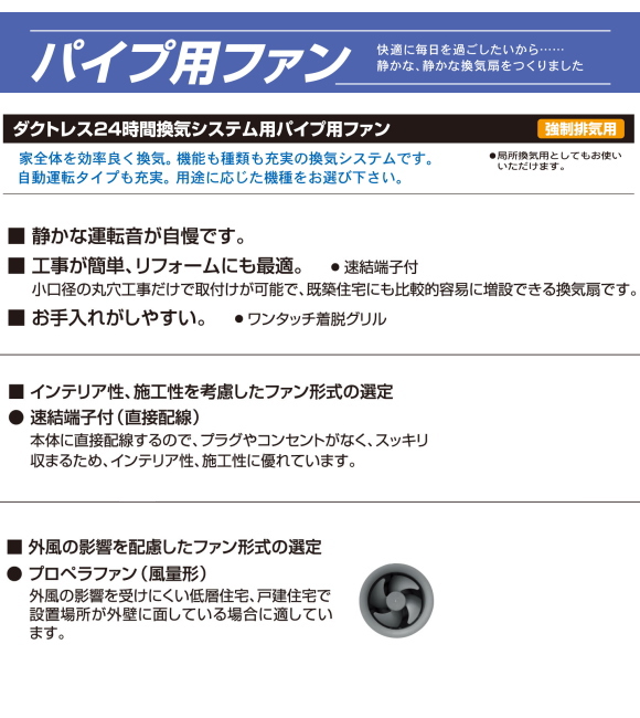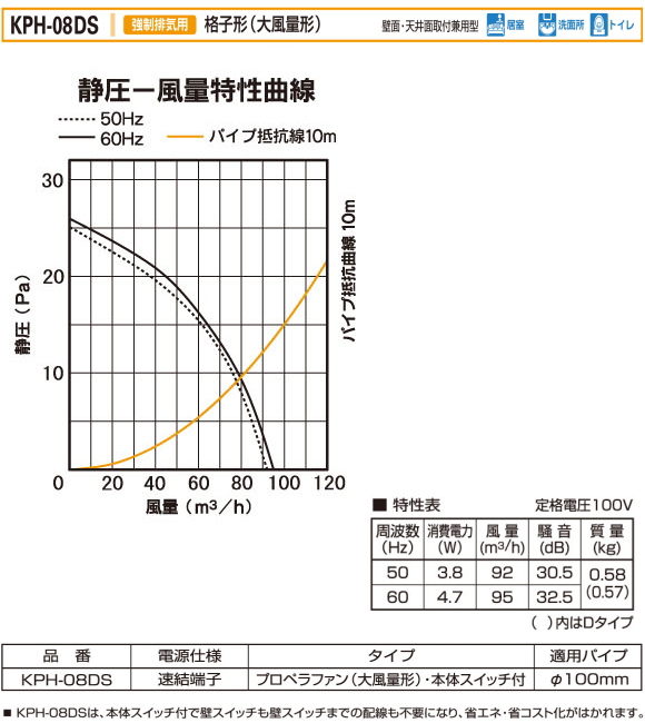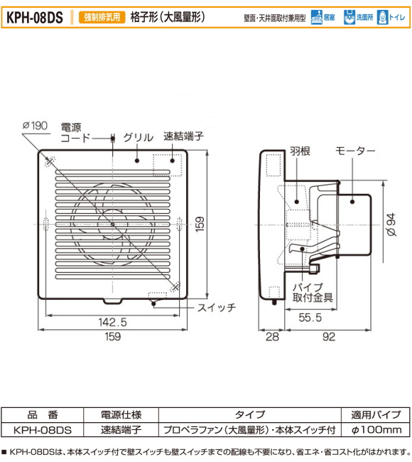 バクマ工業 KPH-08DS 強制排気用 格子形(大風量形) 連結端子付 プロペラファン(大風量形)・本体スイッチ付き 壁面・天井面取付兼用型 パイプ用ファン 24時間換気システム