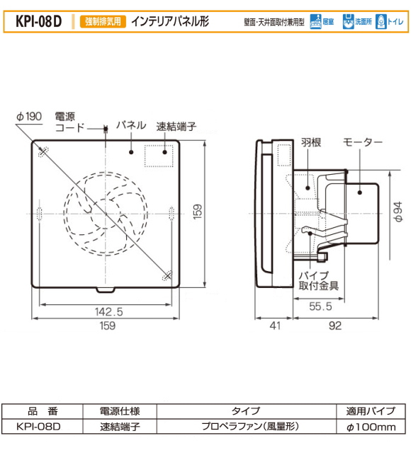 バクマ工業 KPI-08D 強制排気用 インテリアパネル形 連結端子付 プロペラファン(風量形) 壁面・天井面取付兼用型 パイプ用ファン 24時間換気システム