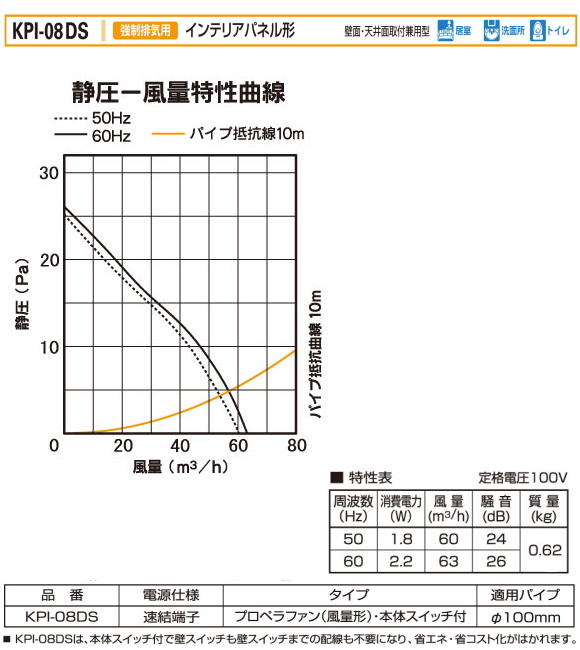 バクマ工業 KPI-08DS 強制排気用 インテリアパネル形 連結端子付 プロペラファン(風量形)・本体スイッチ付き 壁面・天井面取付兼用型 パイプ用ファン 24時間換気システム