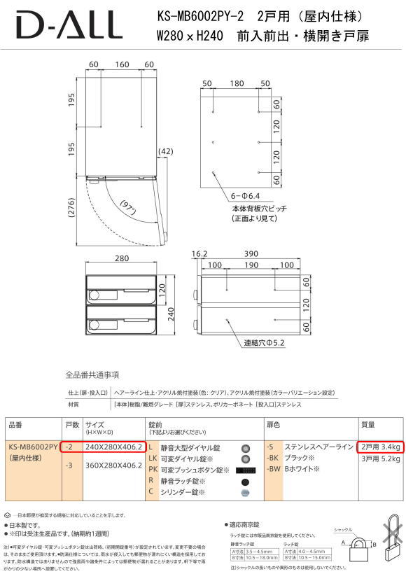 ナスタ 集合郵便受箱(屋内仕様)D-ALL(ディーオール) KS-MB4002PY-2。W360XH240 2戸用 前入前出・横開き扉 日本郵便推奨規格対応品。最大投函可能サイズ 340mmx260mmx35mm。大型郵便に対応したポストです。