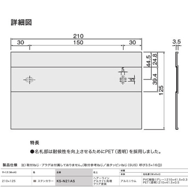 | 名札部(WxHxt) | PVC樹脂(グレー)210x41.5x0.3 PET(透明) 210x41.5x0.5 |