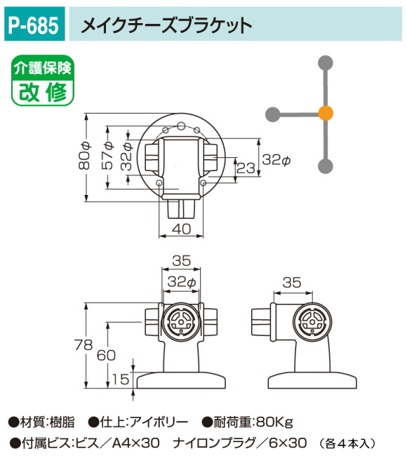 バリアフリー メイク手スリシリーズ 浴室対応樹脂製手すり部品。丸喜金属 P-680 メイクT型ブラケット 1個販売