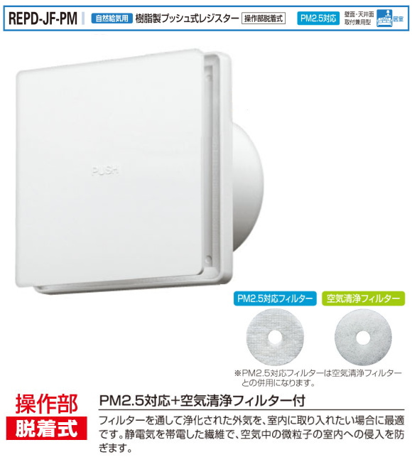 バクマ工業 REPD-100JF-PM 自然給気用 樹脂製プッシュ式レジスター PM2.5対応+空気清浄フィルター付 操作部脱着式