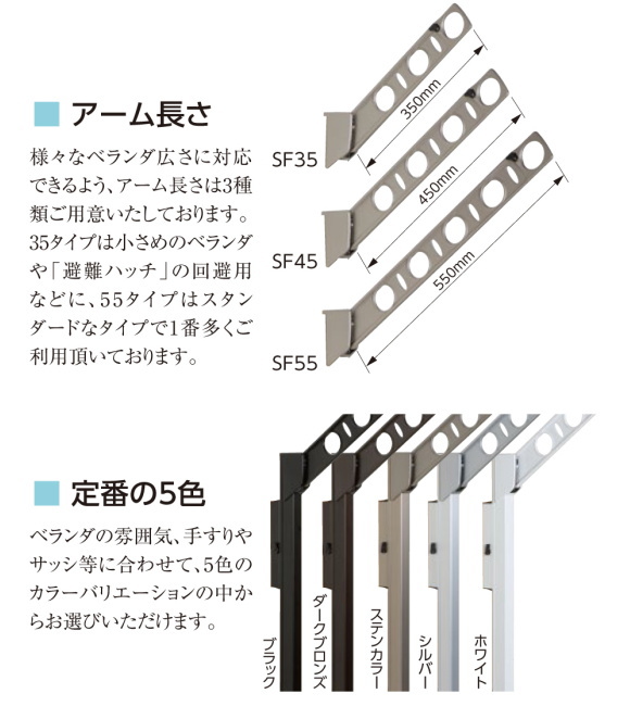 | ●アームは斜上にと、垂直収納が可能です。 ●音止め部品により、強風時や操作時の不快な金属音を大幅軽減した設計 ●手すりやサッシなどに合わせて、5色のカラーバリエーションより選択できます。 ●SF55はスタンダードなタイプで多くご利用されているサイズです。 ●価格は1セット2本入りの価格です。取付ビス、物干し竿などはついていません。 |