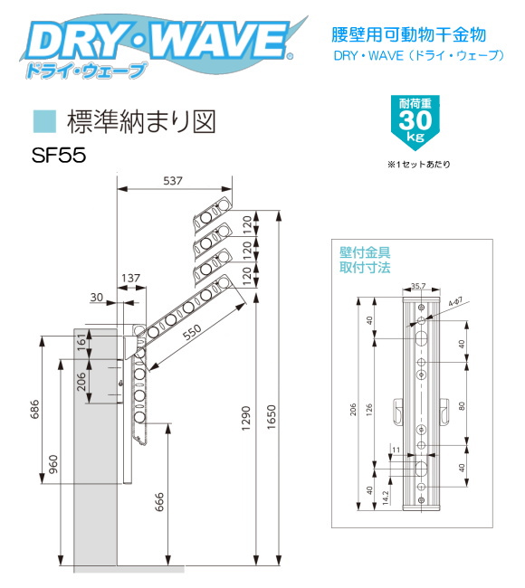 | 腰窓壁用物干金物 ドライウェーブSF55 (1セット2本いり) 上下スライド式 | |