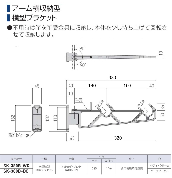 新協和 バルコニー物干金物(横収納型)SK-380B 1セット2本組販売(アーム長さ水平時380mm)アーム横収納型・縦型ブラケット