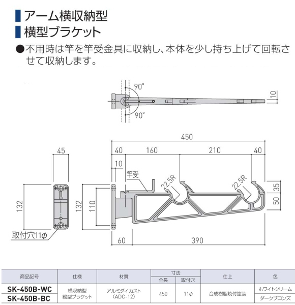 新協和 バルコニー物干金物(横収納型)SK-450A 1セット2本組販売(アーム長さ水平時450mm)アーム横収納型・横型ブラケット