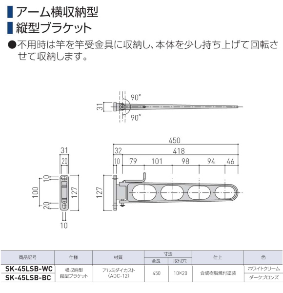 新協和 バルコニー物干金物(横収納型)SK-45LSB 1セット2本組販売(アーム長さ水平時450mm)アーム横収納型・縦型ブラケット