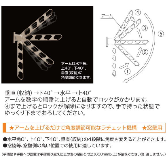 物干しアームの角度を水平角0°、40°の2段階に調整できます