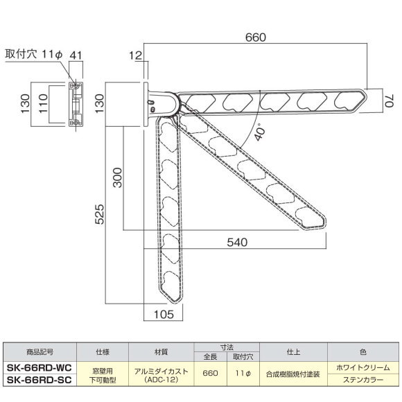 窓壁用 物干金物 新協和 SK-66RF 1セット2本組販売(アーム長さ水平時660mm)