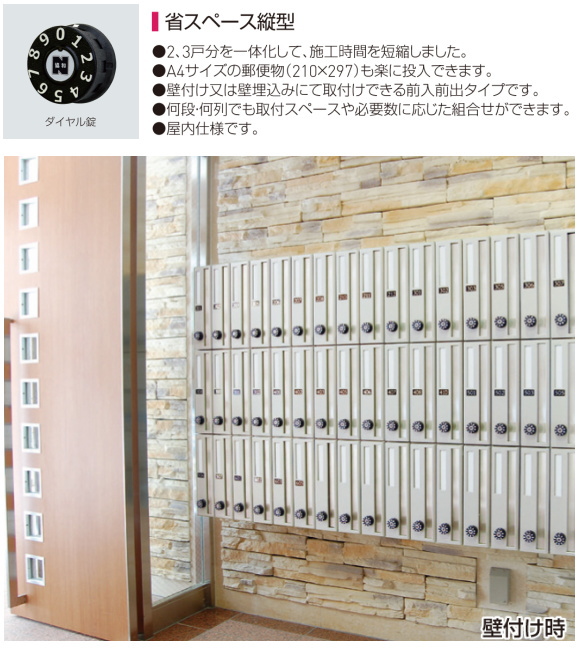 新協和 郵便受箱(横型・静音ダイヤル錠付)前入前出型 SMP-37-2FF 3戸用 省スペース縦型 A4サイズの郵便物(210x297)も楽に投入できます。