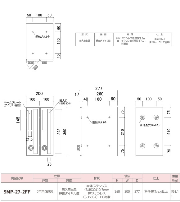 新協和 郵便受箱(1戸用)前入前出型 SMP-1S サイズ・質量H266xW336xD140 2.3kg