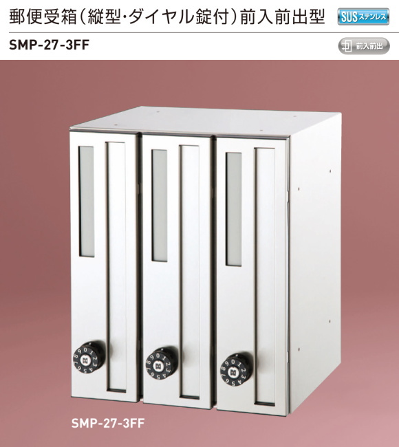 新協和 郵便受箱(ダイヤル・ラッチロック錠付)前入前出型 横型 3戸用 SMP-19型 ステンレスHL。抜き取り防止プレート付。
