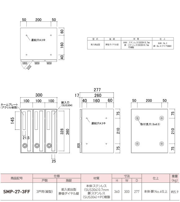 新協和 郵便受箱(1戸用)前入前出型 SMP-1S サイズ・質量H266xW336xD140 2.3kg