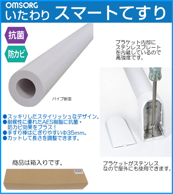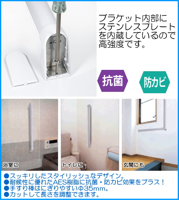 | 備考 | ●手すり製品寸法:600x600mm 安全荷量80kg。 ●浴室やトイレ洗面所などの水まわりや勝手口やベランダ等屋外にも取付可能。 ●スッキリしたスタイリッシュなデザイン。 ●耐候性に優れたAES樹脂に抗菌・防カビ効果をプラス! ●手すり棒はにぎりやすいФ35mm ●手すり棒はカットして長さ調整できます。 |