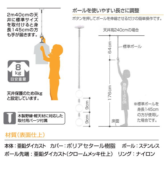 ポール長さ(三段階調整):最小600mm 調整寸法 700mm 800mm 900mm(取付時) 耐荷重1本あたり 8kg