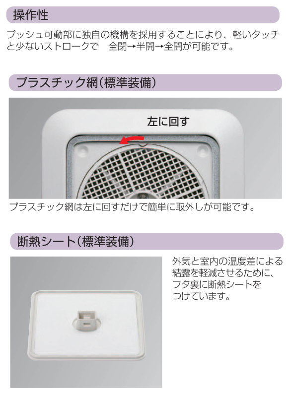 プッシュ開閉式。24時間換気システムに適応した商品です。