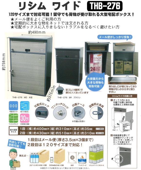 | ケージーワイ工業 ポスト付宅配ボックス リシムワイドTHB-276WD 木目(上段ポスト/下段宅配BOX) 1段目:メール便対応 2段目120サイズまで対応! 製品寸法 奥行37.5×高さ75.8×幅49cm |