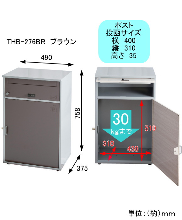 | ●最大投函サイズ ・1段:(横)約400mm×(縦)約310mm×(高さ)約35mm ・2段:(横)約430mm×(縦)約510mm×(高さ)約310mm ●2段目最大積載重量30kg ●盗難防止金具付 ●付属品:キー2本、印鑑ケース1個、使い方シール |