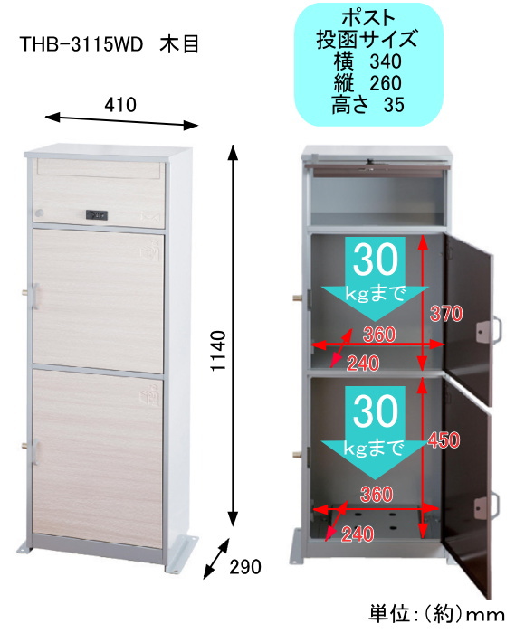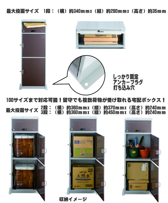| ●最大投函サイズ ・1段:(横)約340mm×(縦)約260mm×(高さ)約35mm ・2段:(横)約360mm×(縦)約370mm×(高さ)約240mm ・3段:(横)約360mm×(縦)約450mm×(高さ)約240mm ●2段目 3段目 最大積載重量30kg ●付属品:キー2本(2、3段目用同一キー)、印鑑ケース2個、使い方シール、アンカープラグ |